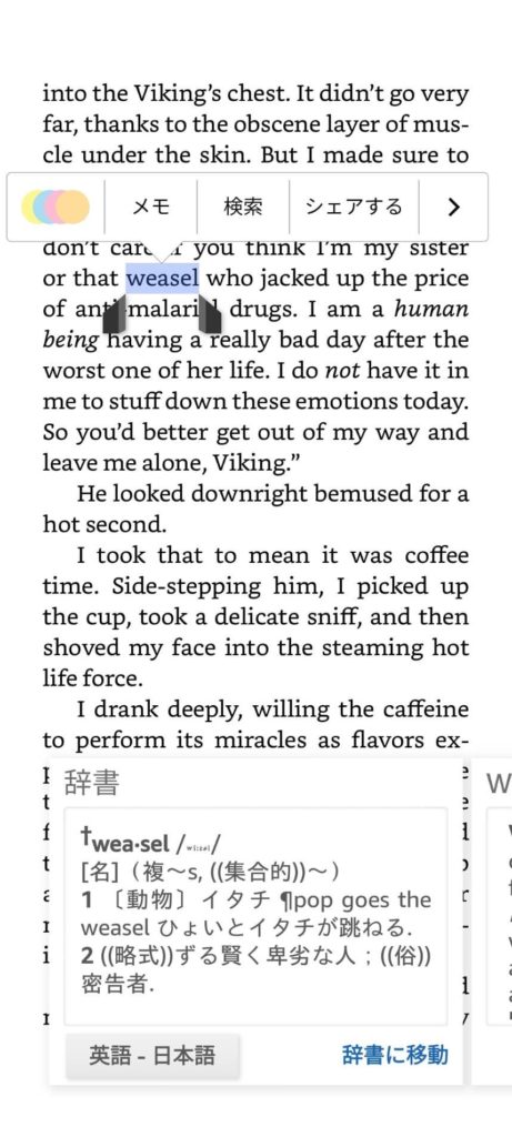 Kindleには辞書機能というものがあり、読んでいてわからない単語が出てきたら、その単語を長押しすると辞書が呼び出されて簡単に意味を確認することができます。