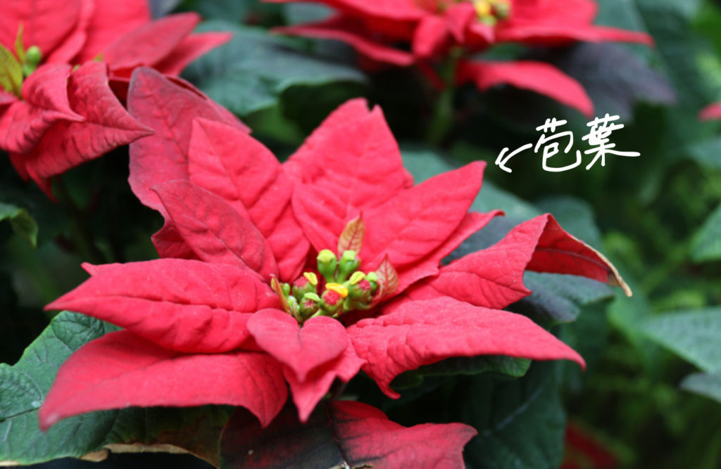 例えば、クリスマスによくみかける赤い「ポインセチア」は、花に見える赤い部分は実は苞葉だそうだ。